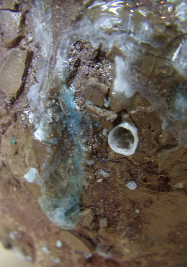 J'explore le travail mécanique des matériaux entre eux et leur réaction à la cuisson, en procédant par couches de terres, porcelaines, barbotines, morceaux cuits ou non cuits de terres colorées ou naturelles, métal et verre, sur une déclinaison d'une quinzaine de pièces percées.