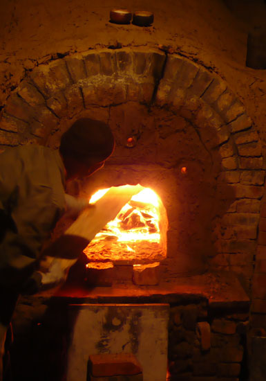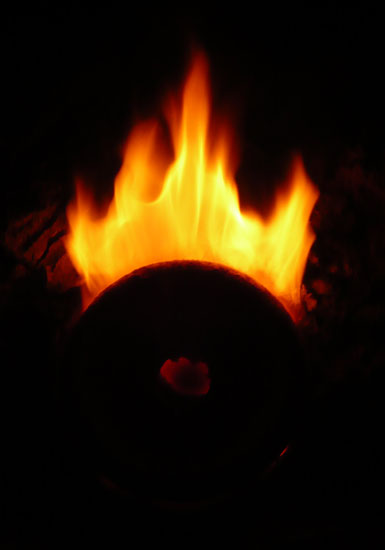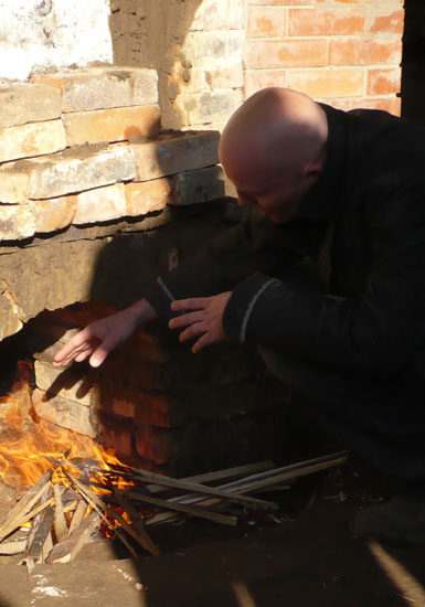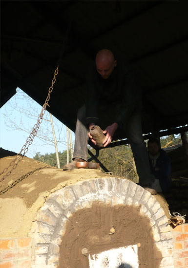 On commence doucement à pousser le bois à l’intérieur du four pour sécher progressivement les pièces.Petit a petit on accélère le rythme. Le bois est poussé à l’intérieur du four……Cette expérience est incroyable, elle nécessite une attention constante, être à l’écoute du four et observer la couleur de la fumée. Il s’agit de s’adapter aux différents facteurs qui interviennent dans la cuisson : le temps, le vent, la fatigue des équipes.