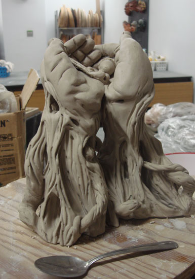 L'idée de mon projet de résidence m'est venue quand la technicienne des fours céramiques, France Allaire, m'a informée qu'il était possible de faire brûler d'autres matériaux dans les fours, ce qui n'est pas autorisé dans mon ancienne école à cause de l'aération moins puissante.