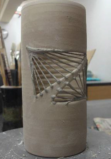 J'ai décidé de reprendre ce concept de trompe-l'oeil en céramique et de le réaliser avec des fils en coton récupérés dans des chutes de l'atelier de tissage et de les tremper dans de la terre liquide pour obtenir un quadrillage plus précis (le fil étant plus fin qu'un boudin de terre) donc plus efficace.