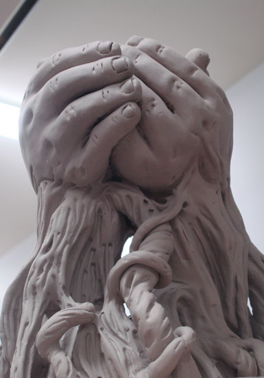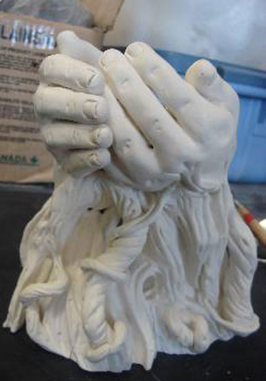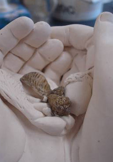 La sculpture que j'ai créée en résidence à la M.M.A.Q. représente deux jeunes mains qui se tiennent l'une à l'autre comme pour protéger un trésor. Ces deux mains se transforment en racines. Le trésor au centre des deux paumes est représenté par trois sortes de graines : trois pépins de raisin représentent l'Alsace, deux graines d'érable représentent le Québec, et le Gland au milieu fait le lien avec L'homme qui plantait des arbres.