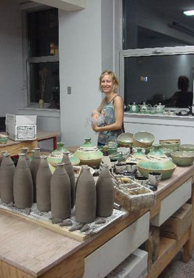 À mon arrivée à la Maison des Métiers d'Arts de Québec (M.M.A.Q.) j'ai visité, avec la directrice Carole Baillargeon, les ateliers des différentes disciplines : sculpture sur bois, métal et pierre, le tissage et la céramique. Accueillie tout de suite très chaleureusement, j'ai disposé d'une table de travail, d'outils, de matières premières, de rangements et d'étagères pour mes futures pièces.