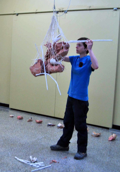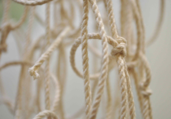 Pour ce projet, j’ai eu beaucoup de chance puisque Jean (le technicien de l’atelier textile) est un ancien marin et qu’il sait donc confectionner des filets de pêche. Nous avons discuté tous les deux de mon projet afin de déterminer la corde à choisir en fonction du poids total que devra supporter le filet et aussi en tenant compte de l’esthétique, dans le sens où je ne souhaite pas que le filet soit trop présent et qu’il nuise à la lecture des pièces qu’il va retenir.