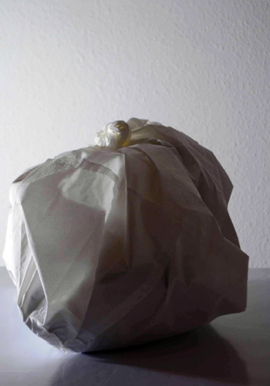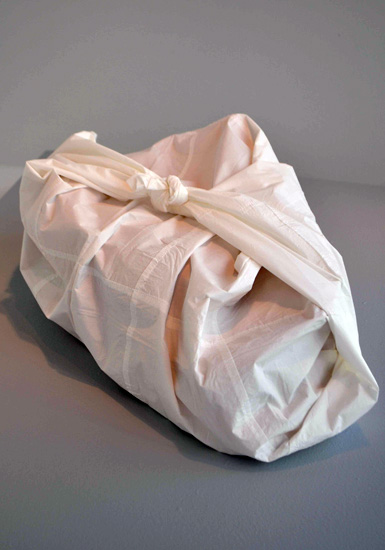 Le projet n°2, "Les nœuds de chagrin", donne suite à Histoires de Fragments (des cailloux en céramique réparés à l’aide d’élastiques en caoutchouc). Je suis repartie à l’origine de cette histoire, au moment où j’ai enveloppé des cailloux brisés dans de petits mouchoirs en coton. Cette douceur qui rassemble les morceaux éparpillés me faisait envie. Des petits paquets tout fragiles, très doux, qui donnent envie de s’approcher et de découvrir ce qui est caché, protégé à l’intérieur.