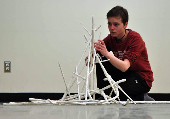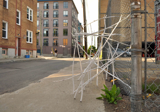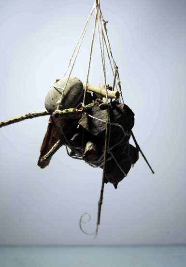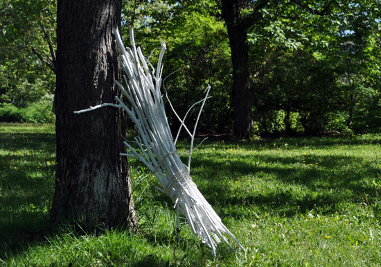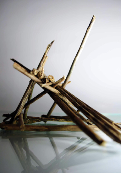 Le projet n°1, "Nous bâtirons des ponts pour nous retrouver", s’inspire du jeu de société Mikado et des barrages de castors. Il ne s’agit pas de reproduire avec exactitude une hutte de castor mais plutôt d’aller à l’essentiel, en réalisant une forme qui porte en elle les attributs constitutifs de cette hutte organique. C’est l’enjeu principal de ce projet : parvenir à construire une demeure, un habitat provisoire, un refuge imaginaire avec des matériaux frêles, et qui soit doux, enviable, dans le sens où l’on ait à cœur le désir de s’y cacher pour y trouver un peu de paix. Je dirais avant tout que j’ai été agréablement surprise de parvenir à réunir et faire tenir debout ces tiges en terre papier de porcelaine.