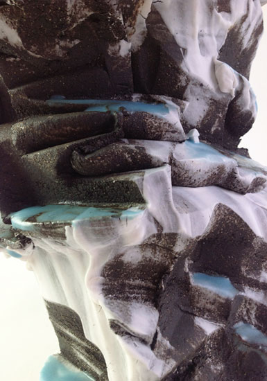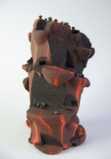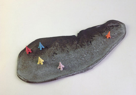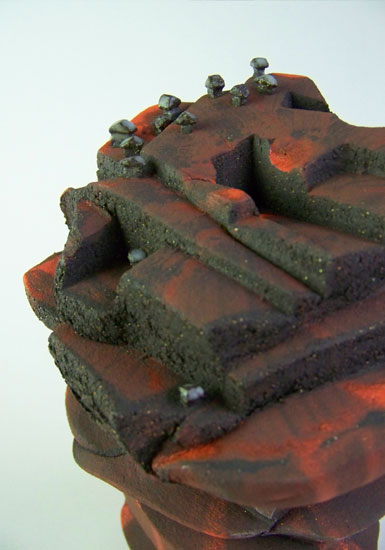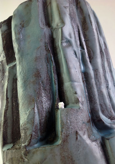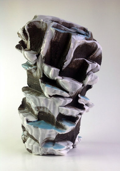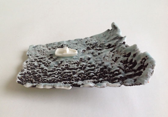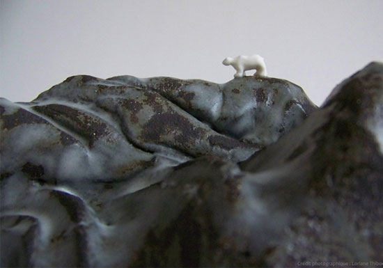 Au final, ce sont une douzaine de sculptures d’environ 6 x 6 x 6 cm à 15 x 15 x 30cm qui ont été fabriquées. Chacune étant le résultat unique des nouvelles expérimentations dans la matière, mais l’ensemble appartenant à cette même intention de traces et de distorsions. Cuites à 1280˙C en oxydation dans un four électrique, les sculptures ont été essentiellement fabriquées avec un grès noir chamotté, un engobe de porcelaine translucide (parfois coloré aux pigments) et des glaçures translucides soit lustrées soit satinées. On pourrait parler de certaines de ces pièces comme de paysages-navires, hybrides d’épaves immenses dont une nouvelle forme de vie a pris naissance à leur surface. Qu’on y observe une maison ou un ours polaire, chacun semble vivre dans ce milieu hostile avec un certain naturel. D’autres sculptures sont de formes plutôt verticales et donnent l’impression d’îles-rochers aux formes étranges. Sur la plupart d’entre eux on peut observer de petites habitations, parfois même des villages. À l’image d’un nouvel espace habité ces minuscules bâtiments établissent le schéma d’une colonisation inventée, l’hypothèse d’un monde établi dans un paysage aux lignes abruptes et inhospitalières....