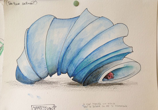 Souhaitant sortir de mes réflexes de création, j’ai décidé dès le départ de jouer le tout pour le tout en mettant volontairement de côté mes points d’appui. J’ai supprimé le plus de références possibles et ce jusque dans les détails.