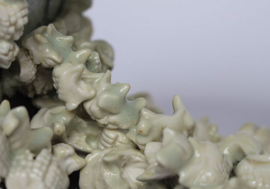 Le défournement est excitant, je dois attendre le refroidissement du four. C’est toujours un moment privilégié pour tous les céramistes. J’ai de magnifiques surprises… dont cette pièce qui s’est déformée, où la magie a opéré. On peut observer un déplacement des petites pièces, comme un souffle du vent qui aurait déraciné les fleurs pour les libérer.