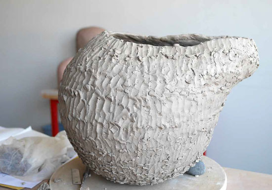 Première confrontation à cette nouvelle terre, un grès rouge de moyenne température, cône 6. Mais très très lisse, dites donc ce grès ! Viens, on ajoute de la petite chamotte mignonne... Je commence une pièce à deux pattes. Qui n’est que deux pattes en fait.