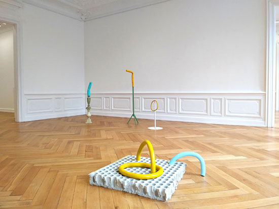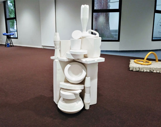 Une exploration riche de différentes terres, de procédés de moulage/profilage/modelage et de traitement de surface a généré de nouvelles idées et permis la réalisation d’un ensemble de sculptures. Les formes faites main (céramique) de facture organique apportent une autre temporalité au corpus fabriqué de matériaux divers (argile, plâtre, objets recyclés, mobilier). Étant uniques, la fabrication des pièces céramiques implique temps et répétition de gestes. Elles contrastent en cela des objets usinés d’apparence immuable et reproductibles en série. Ces derniers, que l’on reconnait, ajoutent un point d’ancrage tout en demeurant une énigme, une variable inconnue à l’équation.