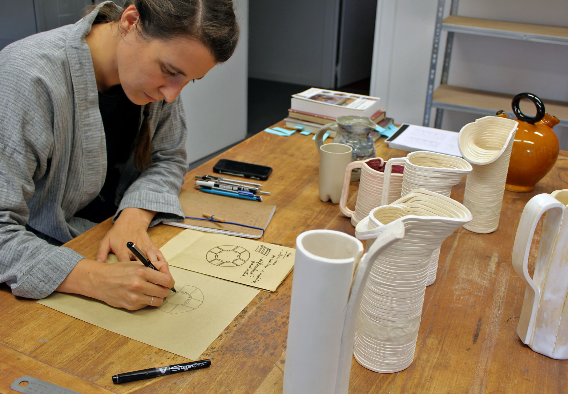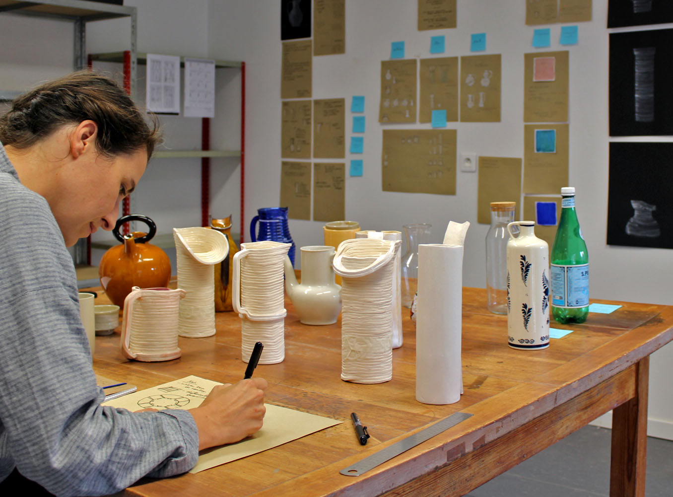 Le fil est l’unité de construction qu’elle a choisie. Il permet de rendre visible et même d’affirmer le dessin de l’objet. Le fil dessine et souligne les espaces déterminant la fonction de l’objet.Cette construction donne à voir l’objet comme un ensemble de parties distinctes mais interdépendantes et reliées. Initiée en 2015, cette recherche s’est développée de septembre 2022 à janvier 2023, dans le cadre de la résidence design et céramique à l’IEAC. L’enjeu était de travailler sur la carafe d’eau en s’intéressant au mode de production sériel par le moulage en plâtre. L’objectif a été de concevoir une collection 3 carafes d’eau singulières dont les contenances et formes correspondent à des usages différents.