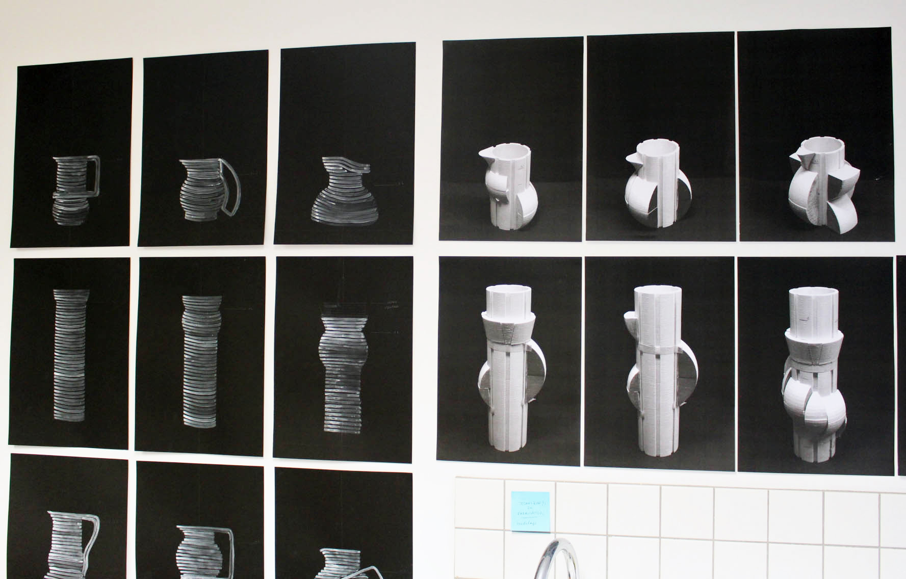 La recherche de formes a débuté naturellement par le dessin, en composant avec les volumes nécessaires aux fonctions. Ce dessin s’expérimente rapidement dans l’espace avec la matière elle-même, extrudée en fils. Des outils spécifiques à la production des modèles ont été dessinés et produits, par l’impression 3D.