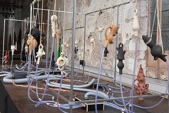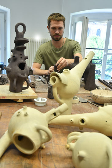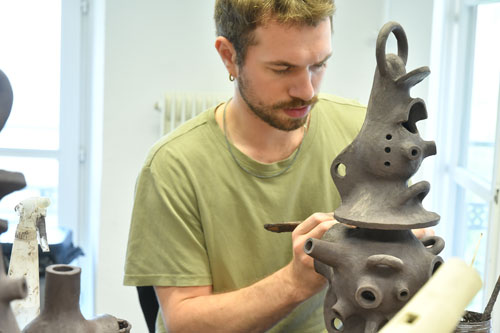 Grâce à l’IEAC, Thomas Besset a pu rencontrer Monsieur Patrick Armand de la réputée manufacture d’orgues Muhleisen à Eschau, une rencontre qui a enrichi son projet. Par la suite, l’artiste a poursuivi son travail lors de nouvelles périodes de résidence en octobre, décembre 2024 et février 2025. Il a d’abord réalisé différentes flûtes en grès avant de modeler des formes aux reliefs internes complexes destinées à faire résonner d’autres instruments, créant ainsi des caisses de résonance uniques.