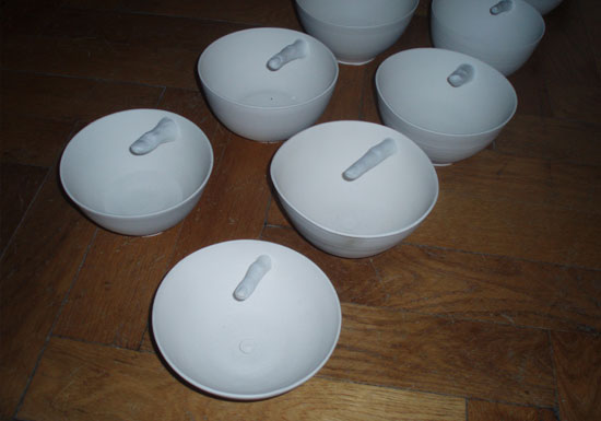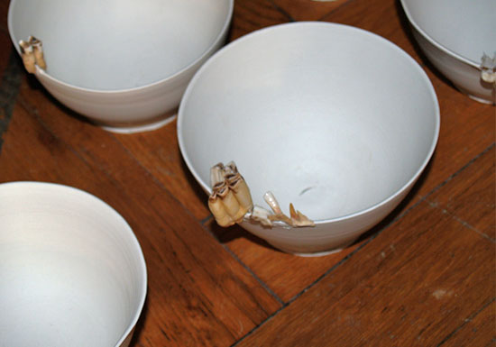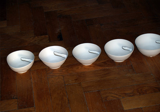 L’installation que je propose, tend à traduire l’émotion qui me submerge au terme de cette formation. Dans ce miroir, je vois les objets s’affronter, se confronter. Ils envahissent mon intimité, me nourrissent, me rassasient, m’écœurent, m’angoissent et m’émerveillent tout en même temps. Ils incarnent si bien notre fragilité, notre solidité. Je perçois une analogie entre le contenant céramique et le corps qui contient et retient notre vitalité.