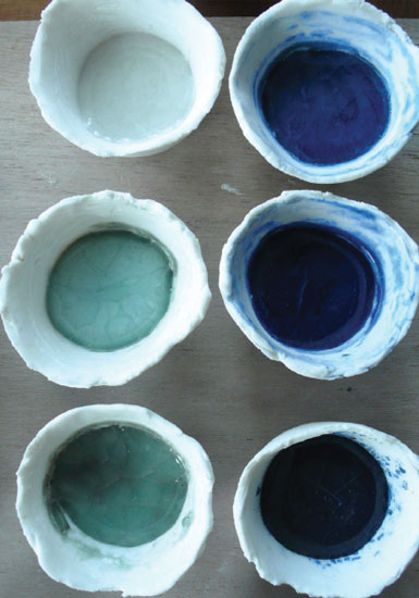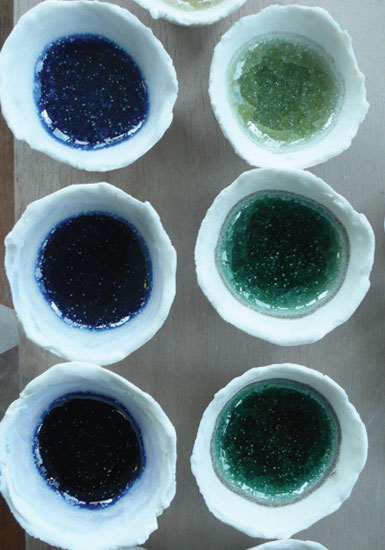 Les nombreux essais ont été réalisés dans de petits bols estampés en porcelaine et remplis à ras-bord afin d’obtenir des résultats proches du verre et de la pâte de verre.