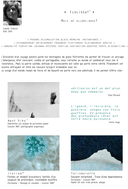 Portée par la poétique des paysages, de leur interprétation et de la charge mémorielle qu’ils véhiculent, j’ai tenté dans ce projet de matérialiser des «instants», souvenirs d’un passage, d’une certaine permanence, à travers l’évocation d’un voyage, la traversée d’un AILLEURS.