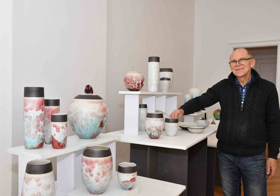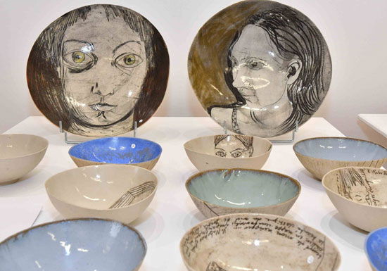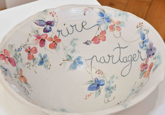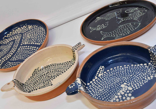 Ses créations sont réalisées au tour ou à la plaque, décorées au pinceau sous couverte puis cuites à 1200° C – 1300 °C.