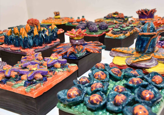 Vases fleuris, bonbonnières à drôles de chapeau, lézards alanguis, colibris multicolores, mouches aux yeux globuleux ... composent son univers personnel.