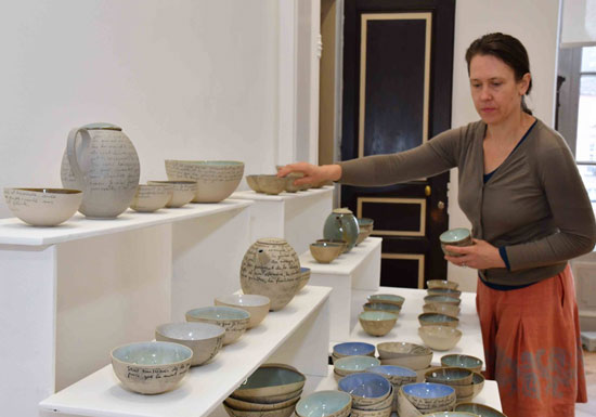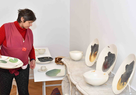 Le bol, objet d'apparence simple, représente pour elle tout un univers profond et complexe, exploré sous différentes formes. La nature et le corps humain sont ses principales sources d'inspiration. Le travail de la ligne s'est également invité dans une série de pièces gravées de bribes de textes.