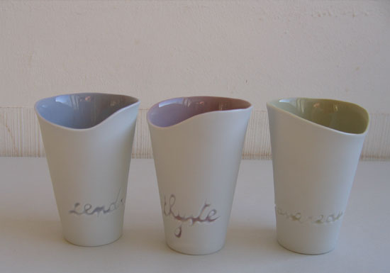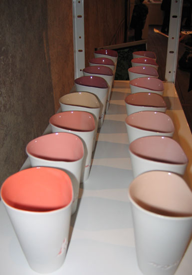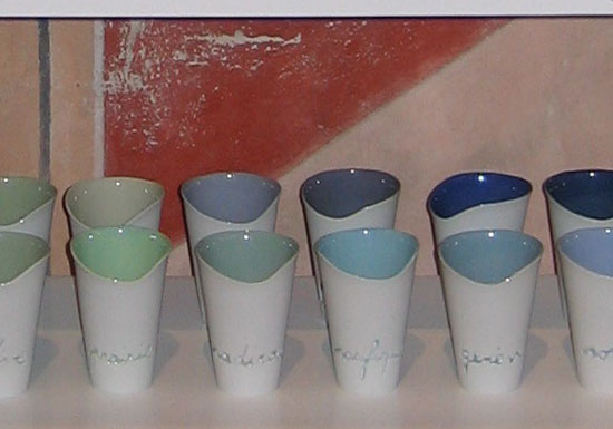 Des échantillonnages retrouvés, j'ai souhaité que découle un nuancier qui, toujours en lien avec la forme de la bobine, se décline en une série de gobelets colorés. Sur chacun d'eux est gravé le nom du coloris utilisé à l'époque, comme, par exemple « prèle », « piment », « passereau »...