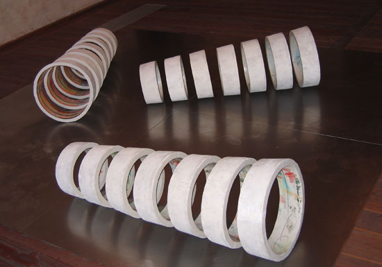 Installation : trois bobines au sol, une étagère supportant un nuancier de gobelets et un diaporama.