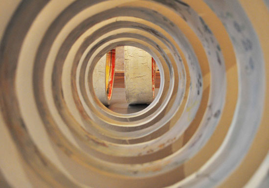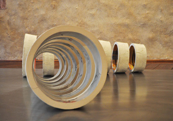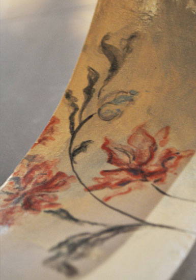 J'ai très envie d'évoquer la bobine. Je vais donc travailler à partir d'une forme conique modelée selon la technique du colombin, accompagnée par une intervention sur le tour. J'aimerais que son aspect extérieur se révèle avec l'idée du palimpseste. A l'intérieur, plutôt un contraste : quelque chose de vif, coloré, vivant, rappelant le savoir-faire de ceux qui ont participé à la réalisation de ces tissus.