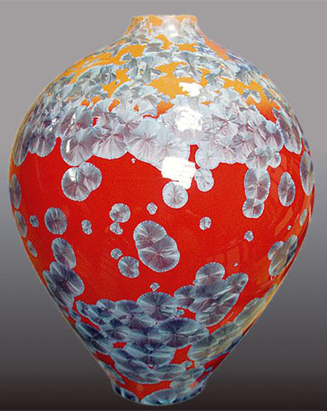 La cuisson du biscuit se fait à 1120°C, tandis que celle de l’émail varie de 1280 à 1300°C. La formation des cristaux a lieu lors d’un refroidissement extrêmement lent de la surface émaillée, par paliers précis et dirigés. L’accent n’est pas mis sur la largeur des cristaux, mais sur l’harmonie esthétique et élégante avec la forme de l’objet.