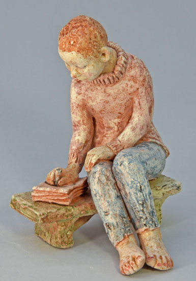 Dans cet environnement préservé, elle travaille une terre rouge très chamottée. C'est une terre dure, composée d'éléments irréguliers et texturés qui se révèlent en travaillant la matière. Ces "manifestations naturelles" sont l'inspiration de l'artiste qui les laisse visibles. La structure de la matière souligne l'expression des sculptures.