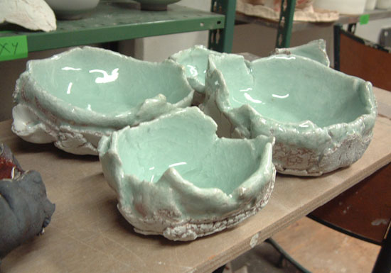 Elle est jetée au sol pour s'étirer, puis sur de grandes formes lisses et tendues de coupes et de bol, en plâtre.