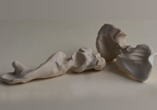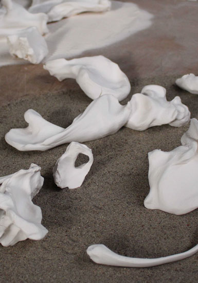 Je prends un bloc de porcelaine. Je démarre un geste. Je l’amplifie, le répète. Petit à petit une forme se dégage et à partir de celle-ci un autre geste fait appel. Je prends appui sur les formes d’os qui me sont connues pour les retrouver.
