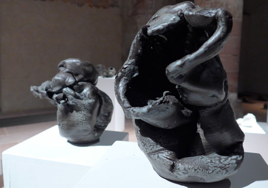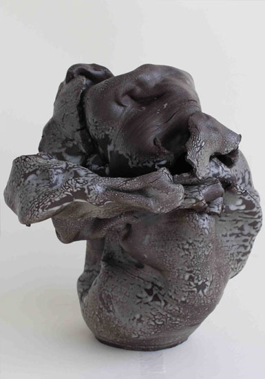 Une fois suffisamment raffermie, j’y applique de l’émail ou de l’engobe. À nouveau je lui fais subir des distorsions, cette fois pour révéler les limites de la matière en surface, dont les sillons de la « naissance » participent à l’effondrement de l’architecture de l’épiderme.