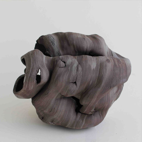 Tourner un pot, cela revient à tourner une peau, une limite entre l’intérieur et l’extérieur. Déformer cette peau revient à lui faire vivre son inertie inhérente : elle s’amollit, craquèle, se déchire. Ce qui reste est un vestige, une mue.