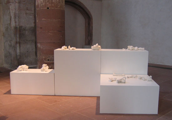 À partir d’un bloc de pâte de porcelaine, sorte d’ivoire malléable, un geste de pression en amène un autre, puis un autre. La matière se meut, la forme se complexifie. Ostéogenèse ! Une somme de gestes fossilisés. Prendre ces fossiles dans ses mains nous fait retrouver ces gestes.