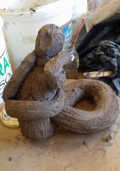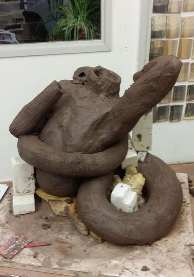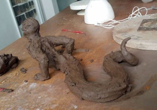 Je me lance sur un second projet de personnage hybride. L'idée d'allier l'homme et le serpent m'attire beaucoup, mais je ne sais pas encore pourquoi, ni ce que j'aimerais dire à travers cette sculpture. Je teste des positions en faisant des dessins et des maquettes.