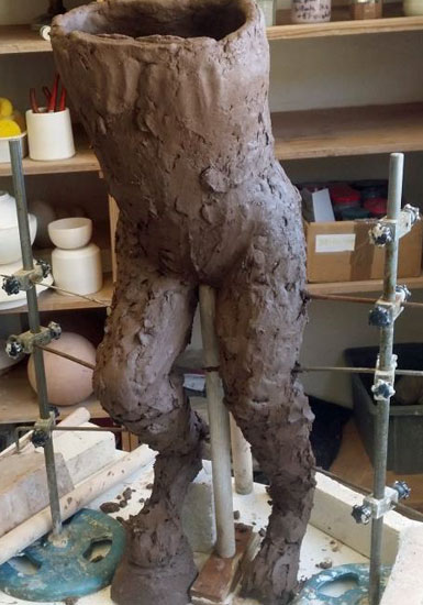 Créer les jambes de ce personnage était très complexe. Je me suis inspiré de Fanny Ferré en essayant de caler ma sculpture pour pouvoir la façonner sans qu'elle s'écroule sous son propre poids. Plusieurs fois elles ont cédé, j'ai dû recommencer encore et encore. Ces jambes étaient pour moi une des plus grandes difficultés dans cette sculpture, il ya un équilibre à trouver qui est nécessaire mais qui freine mon modelage.