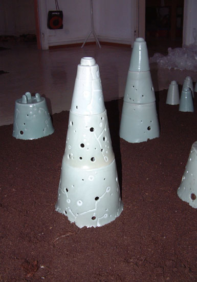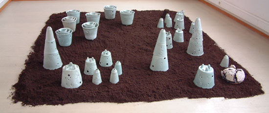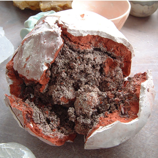 Toutes les pièces ne sont pas cassées systématiquement, le séchage ou la cuisson révèle parfois le cœur de la pièce. Un essai a aussi été réalisé en incluant du plâtre au centre de la pièce; celle-ci a été placée dehors afin de provoquer la cassure sous l’effet de la dilatation de la chaux."