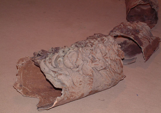 Le choix de la terre fut important, car je souhaitais garder sur mes pièces la trace de sa texture et de sa couleur. Aucune pâte disponible à l’école n’était satisfaisante, j’ai donc dû effectuer plusieurs mélanges et dosages avant de trouver un bon compromis. Mon choix s’est porté sur un mélange de deux terres à grès légèrement chamottées."