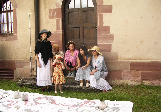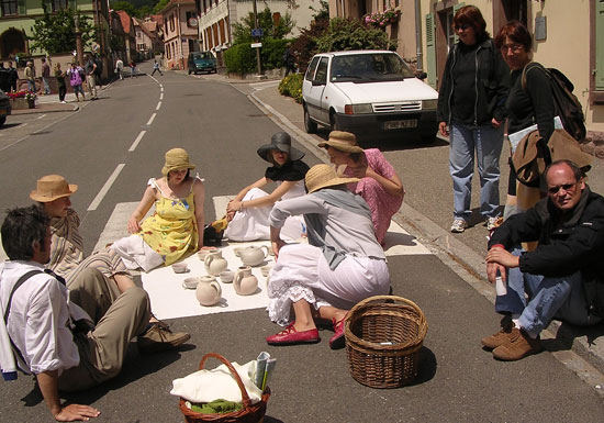 Deux groupes de trois et quatre stagiaires déambulent dans le village, vêtus de clair et chapeautés. Ils portent des paniers contenant un service à thé.