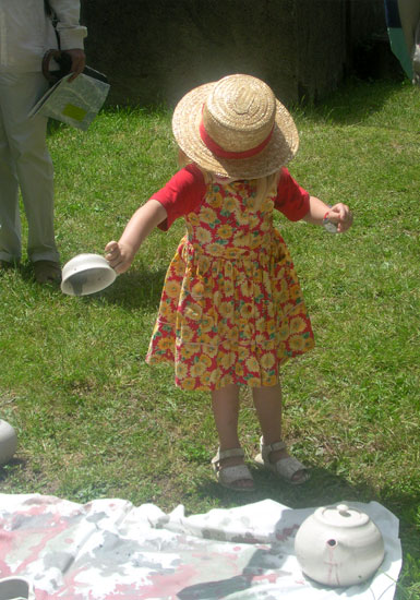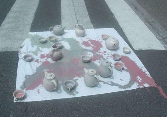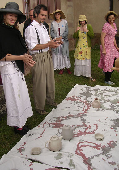 Le service à thé comprend une théière, un pot à lait, une chocolatière emplis de barbotine colorée très liquide et un ensemble de tasses parfois percées.