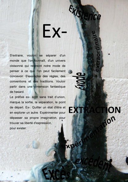 Le préfixe ex- écrit sans trait d’union, marque la sortie, la séparation, le point de départ. Ex-. Quitter un état d'être et en explorer un autre. Expérimenter pour dépasser sa propre imagination, pour trouver sa liberté d'expression, pour exister.