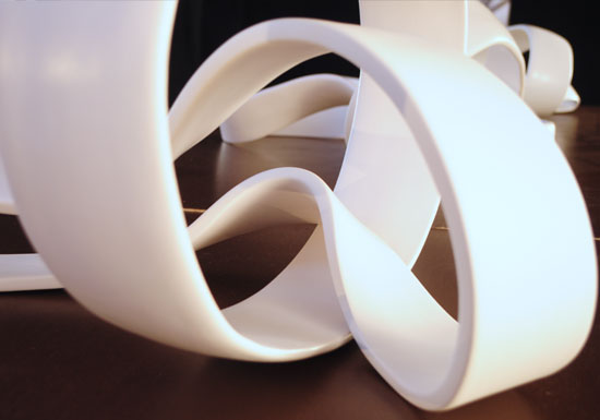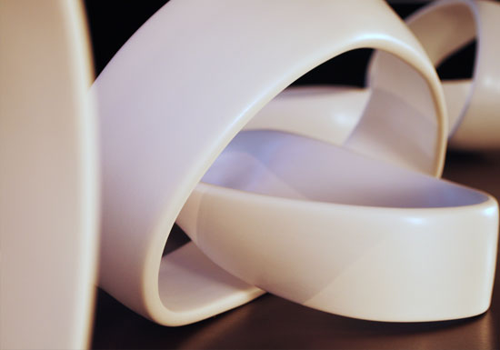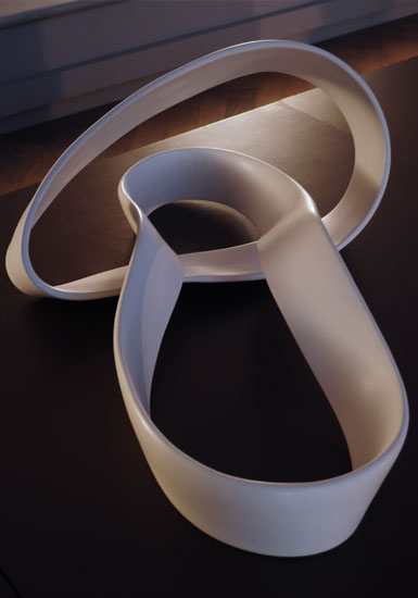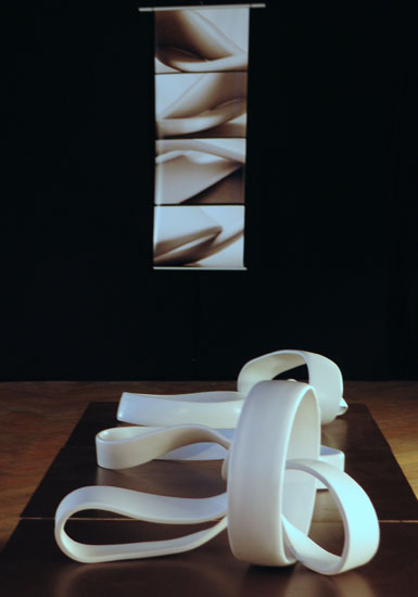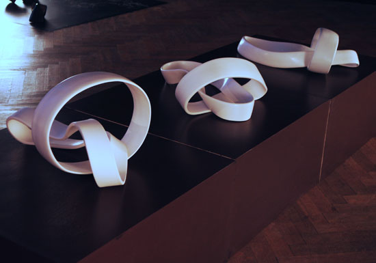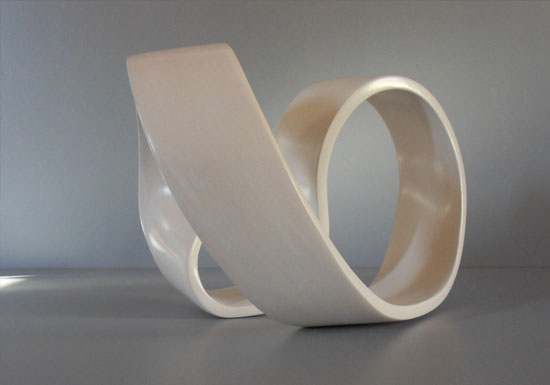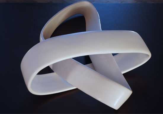 De l'argile blanche, fine et douce naissent des rubans, des anneaux ondulants, fluides, aériens ui ont vocation de nouer, de relier et d'unir. Chaque partie est libre, indépendante et existe par elle-même. A deux, elles formeront un ensemble plus grand, plus fort.