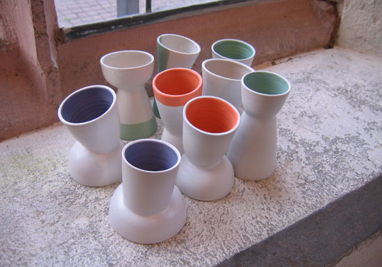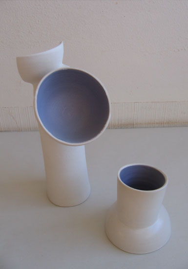 J'avais déjà un travail d'utilitaires classique. J'ai décidé cette année de le pousser, de le retravailler en combinant des formes simples. J'imbrique des volumes basiques, pour donner naissance à des objets sobres, aux lignes tendues. Je tourne ces volumes, puis dans un jeu coloré je reforme un utilitaire.