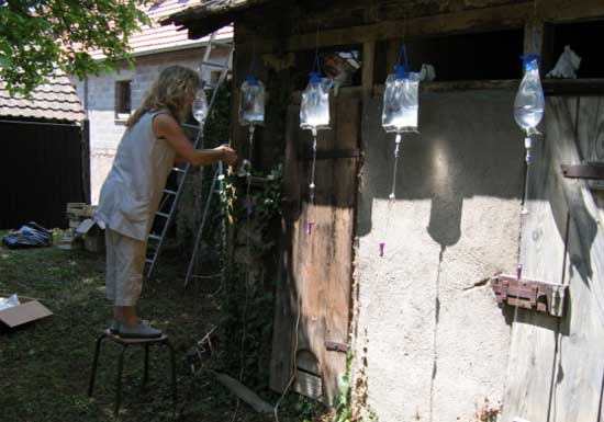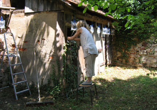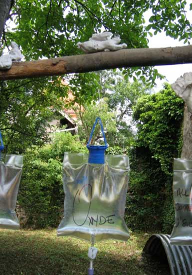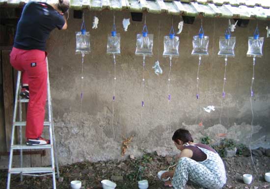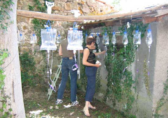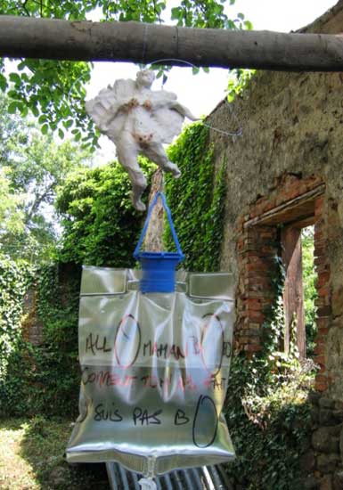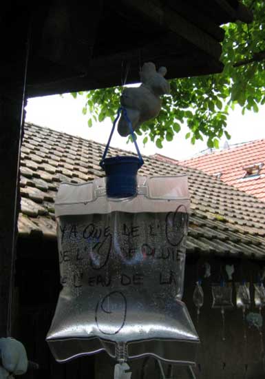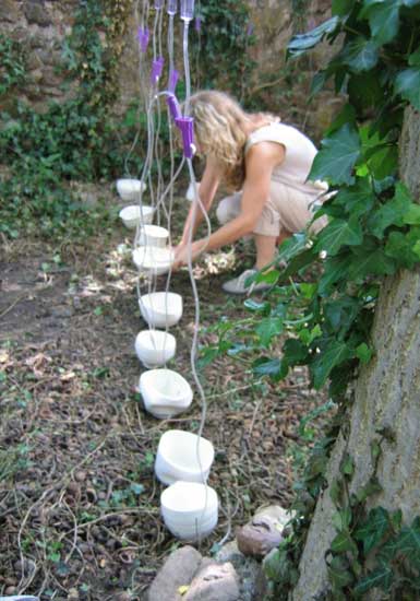 « Ils sont 50, haut perchés, gardiens du précieux liquide délivré au goutte à goutte et recueilli dans de fragiles porcelaines. Humains, animaux, et végétaux peuvent ainsi survivre »Les élèves de l’Institut Européen de Céramique de Guebwiller ont choisi le principe de l’accumulation ur une installation délicate et optimiste. C’est une armée du ciel dont elles rêvent en réonse à toutes les armées de terre, une offensive de l’esprit peut-être, en réponse à la matérialité généralisée.