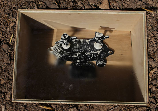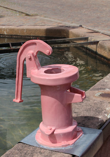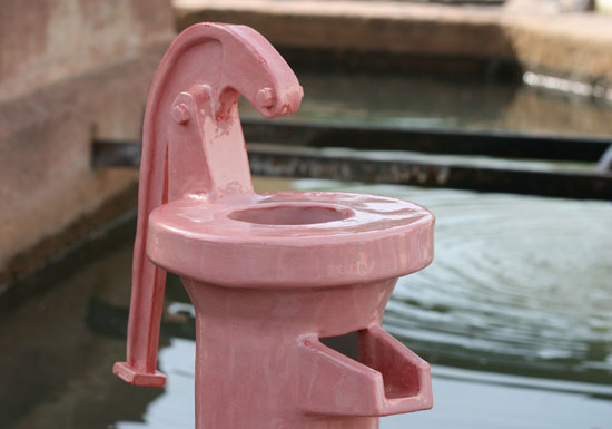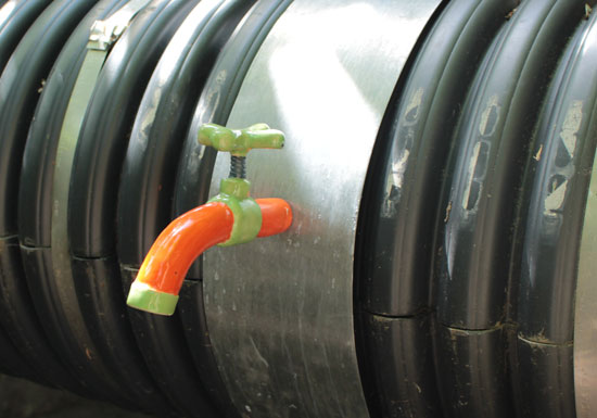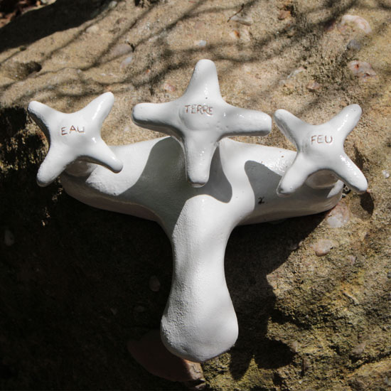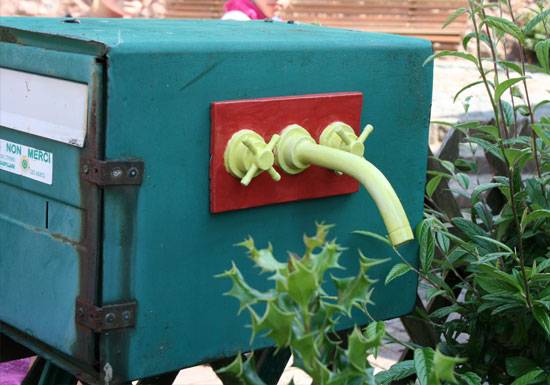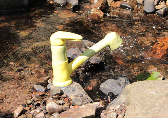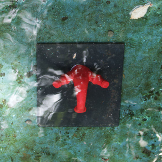 Sous la direction d’Anne-Marie Schœn, les élèves ont réalisé une installation céramique : tuyaux, vannes, conduits apparaissent et disparaissent partout dans le village. Est-ce un circuit d’eau solide parallèle au circuit des rivières et des fontaines ?