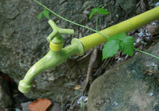 Nos robinets en céramique surgissent, connectés au réseau d'eau solide. Modelés en argile, ils sont la matérialisation ultime et irréversible de l'eau solide.