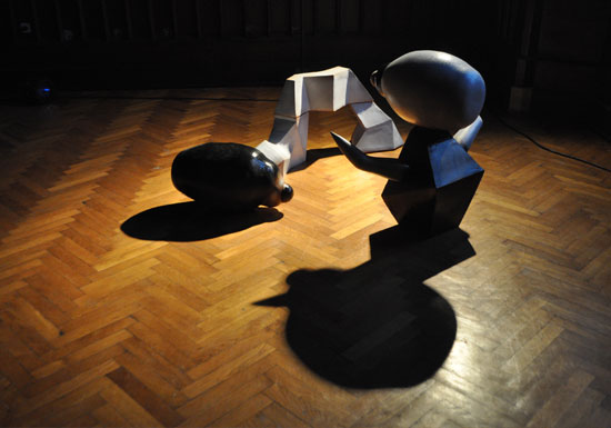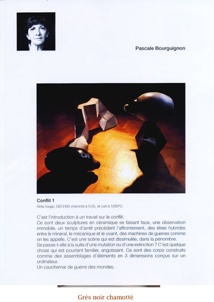 Ce sont deux sculptures en céramique se faisant face, une observation immobile, un temps d'arrêt précédent l'affrontement, des êtres hybrides entre le minéral, le mécanique et le vivant, des machines de guerres comme on les appelle. C'est une scène qui est dissimulée, dans la pénombre....