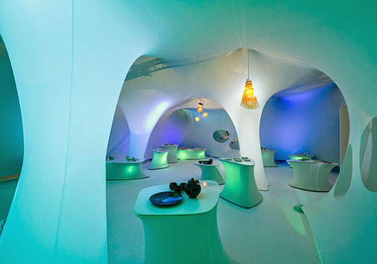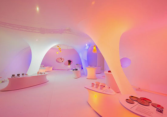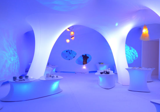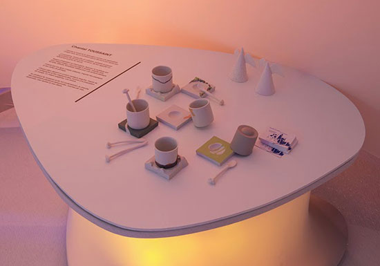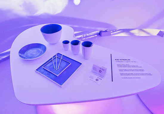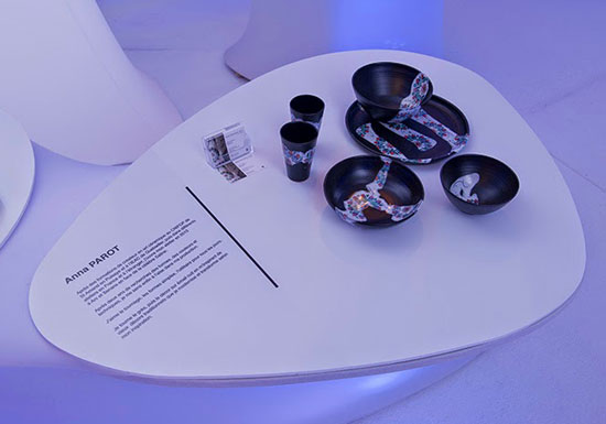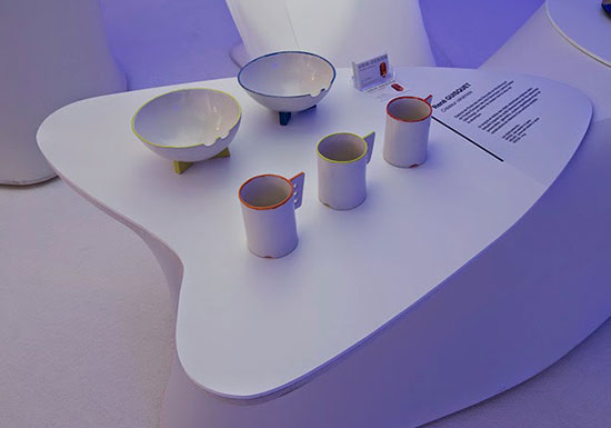 Dans un décor feutré et organique, aux formes arrondies évoquant l’univers de la science fiction des années 70, se niche une sélection de pièces de céramistes.